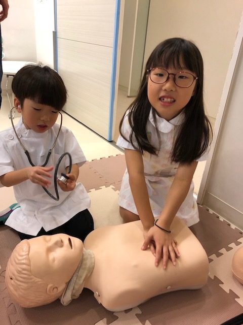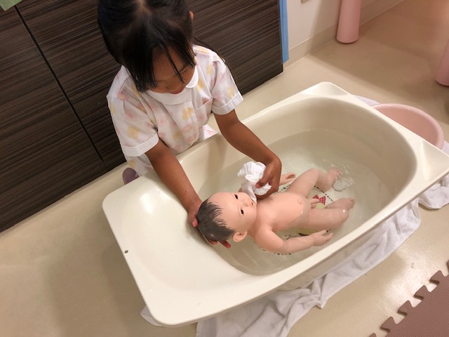 かわいい白衣にお着替えして、あかちゃんの沐浴や心肺蘇生を体験してくれましたよ